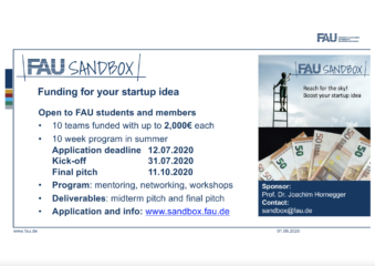 Im vergangenen Jahr wurde erstmalig die FAU Sandbox -ein Innovations-Förderungs-Programm unserer Universität- angeboten. Ziel dieser Unterstützung ist es Gründungsaktivitäten zu fördern. Zusätzlich ermöglicht dieses Format wertvolle Anknüpfungspunkte zu Kontaktnetzwerken und viele weitere Vorteile.